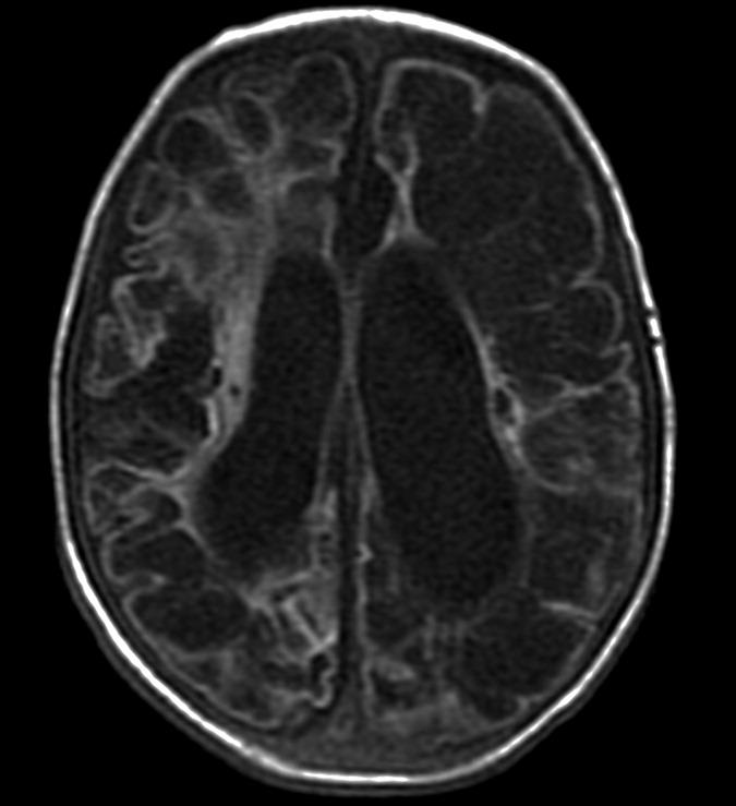 Т1-взвешенная аксиальная томограмма: диффузная кистозная энцефаломаляция с компенсаторной вентрикуломегалией