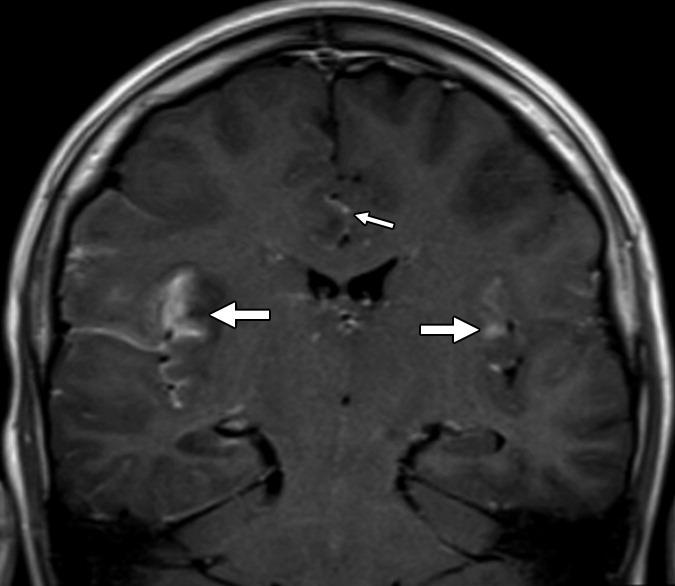 Т1-взвешенное корональное изображение после введения контраста демонстрирует асимметричное двустороннее гириформное и лептоменингальное контрастное усиление больше в области коры островка (большие стрелки) и поясной извилины (меньшая стрелка)