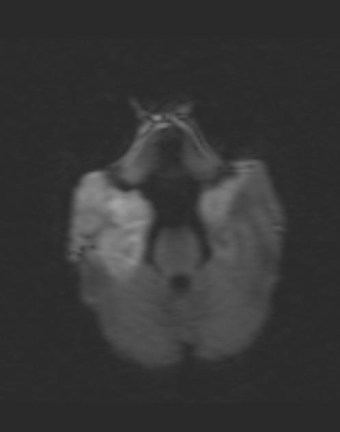 В группе пациентов, у которых развился неонатальный герпетический энцефалит в течение 28 дней после рождения, основными признаками при использовании DWI-последовательности были кортикальные поражения. Двустороннее поражение глубоких слоев коры и белого вещества мозга, визуализируемые на 7-й день, были предикторами плохого прогноза и высокой вероятности развития двигательных и когнитивных расстройств.