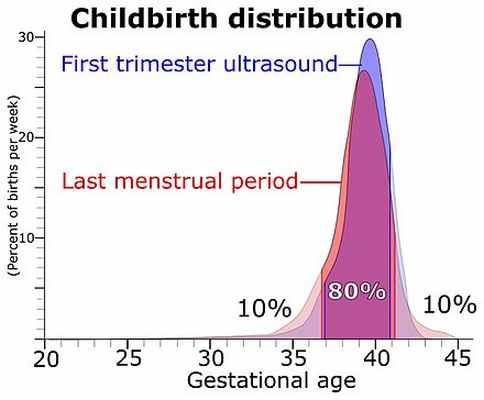 Как правило, официальный срок беременности должен основываться на фактическом начале последнего менструального цикла, если только какой-либо из вышеперечисленных методов не дает расчетную дату, которая отличается больше, чем вариабельность метода, и в этом случае разница, вероятно, не может быть объясняется только этой изменчивостью. [4] Например, если гестационный возраст основан на начале последнего менструального цикла в 9,0 недель, а акушерское ультразвуковое исследование в первом триместре дает предполагаемый гестационный возраст в 10,0 недель (с 2 SD вариабельность ± 8% от оценки, что дает вариабельность ± 0,8 недели), разница в 1,0 недели между тестами больше, чем вариабельность 2 SD оценки ультразвукового исследования, что указывает на то, что следует использовать гестационный возраст, оцененный с помощью ультразвукового исследования. как официальный срок беременности. [4]