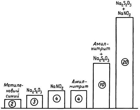 Сравнительная антидотная эффективность наиболее значимых антицианидов, изученная в опытах на собаках, представлена на рис. 16, где цифры в кружочках обозначают количество смертельных доз, от которых предохраняет данный антидот или комбинация. Многолетняя практика экспериментального лечения тяжелых цианидных отравлений в нашей лаборатории подтверждает эти данные. В частности, особо эффективной оказывалась комбинация нитрита натрия и тиосульфата натрия. Экстренное внутривенное последовательное введение этих антидотов спасало животных от гибели даже в судорожно-паралитической стадии интоксикации.
