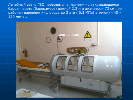 ГБО предполагает нахождение пациента в одноместной барокамере в атмосфере 100% кислорода под избыточным давлением в течение 40 мин и более.