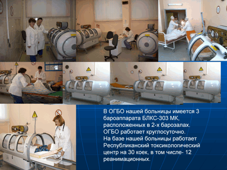 Отделение гипербарической оксигенации оснащено современными барокамерами производства Россия (БЛКС-307), Украина (ОКА-МК), США (SECHRIST – 2800) и имеет многолетний опыт работы, проводя более 1000 сеансов в год. Служба ГБО – единственная в Москве, принимающая пациентов по экстренным показаниям круглосуточно.