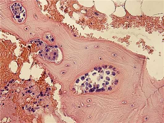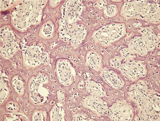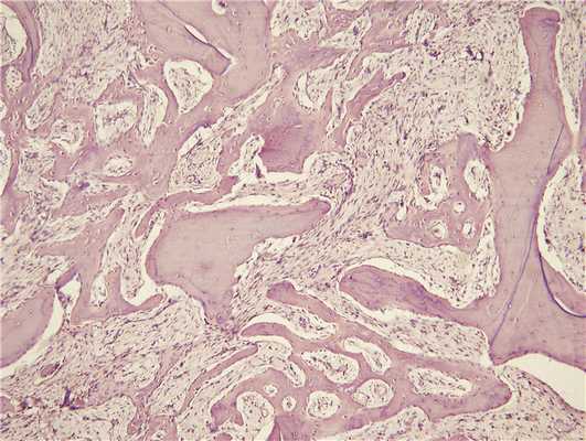 Микроскопия. Интенсивная перестройка костной ткани с усиленным остеокластическим рассасыванием кости; расширение хаверсовых каналов, спонгизация кортикального слоя, истончение костных трабекул; активная пролиферация фиброретикулярной ткани, формирование масс примитивной кости, наслаивающейся как на старые, так и на новые костные структуры; примитивная кость быстро подвергается резорбции и вновь замещается новообразованными костными массами.