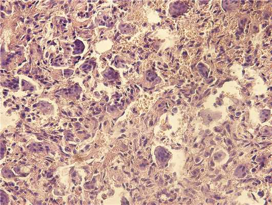 «Бурая опухоль» представлена многочисленными многоядерными остеокластоподобными клетками, фибробластами, макрофагами, примитивными костными трабекулами, полями свежих и старых кровоизлияний, придающих поражению характерный вид.