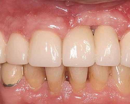 Затем наблюдается прогрессирование гиперплазии десен, вследствие чего происходит деформирование сосочков, а разросшаяся десна перекрывает половину зубной коронки.