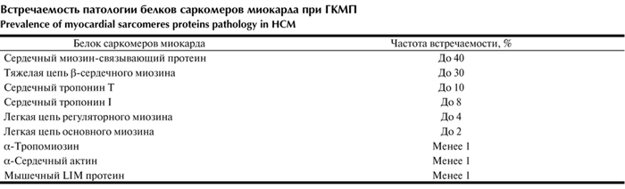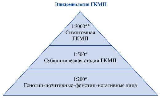 Примечание: * — 1:200 взрослых людей — минимальная распространённость мутантных генов саркомера в общей популяции, 1:500 взрослых людей — распространённость необъяснимой ГЛЖ как главного фенотипического проявления ГКМП, определяемая ЭхоКГ [3]. ** — 1:3000 — распространённость симптомной ГКМП у взрослых в США [4].