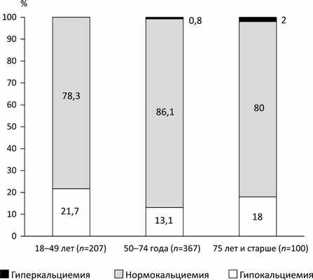 Возрастная группа 75 лет и старше (100 пациентов). Нормокальциемия наблюдалась в 80% случаев (2,25 [2,2; 2,3] ммоль/л), гиперкальциемия — в 2% (с максимальным повышением до 2,88 ммоль/л), гипокальциемия — у 18% пациентов (2,09 [2,01; 2,12] ммоль/л). Статистически значимых различий между женщинами и мужчинами по частоте гипокальциемии также выявлено не было.