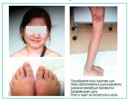 Физическое развитие ниже среднего, гармоничное, телосложение пропорциональное. Sds роста соответствует -1 отклонению от нормы (норма -2+2). Особенности фенотипа: круглое лицо, короткая шея, низко расположенные ушные раковины, широкие межзубные промежутки, сандалевидная щель. Фото 1. По внутренним органам - без особенностей. Щитовидная железа не увеличена, клинически - эутиреоз. Половое развитие - Tanner I (что соответствует возрасту).