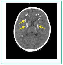 Множественные кальцинаты в веществе головного мозга (желтые стрелки).