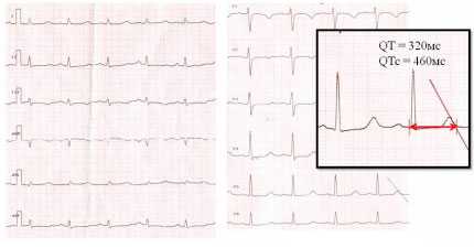 Синусовая тахикардия с ЧСС 110-115 уд/мин. QT = 320 мс, QTc = 510 мс (N