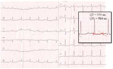 В представленной статье нами описано клиническое наблюдение вторичного синдрома удлиненного интервала QT вследствие гипокальциемии как проявление наследственного синдрома - псевдогипопаратиреоза (наследственной остеодистрофии Олбрайта). В литературе описаны клинические случаи синкопальных состояний вследствие синдрома удлиненного интервала QT на фоне гипокальциемии. В основе патогенеза - асинхронность реполяризации различных участков миокарда желудочков и, как следствие, увеличение ее общей продолжительности. Электрокардиографическим признаком асинхронной реполяризации миокарда (на фоне гипокальциемии) является удлинение интервала QT [9, 10, 11, 12].