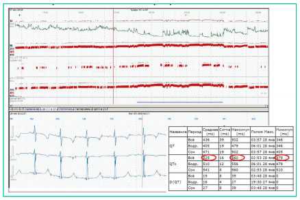 По данным холтеровского мониторирования (рис. 3) имеет место незначительная тахикардия в течение суток; отмечено удлинение интервала QT в течение всего времени исследования; QTmax = 475 мс, meanQTс = 525, maxQTc = 580 мс.