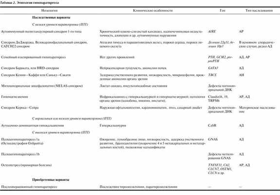 В 75% случаев гипопаратиреоз развивается после хирургического вмешательства на области шеи [3], из-за повреждения или удаления ОЩЖ в ходе операции, а также кровоизлияния в них или развития фиброзных процессов. Вторая по встречаемости форма заболевания – аутоиммуный гипопаратиреоз – обусловлена иммуноопосредованным разрушением клеток ОЩЖ. Он встречается как в качестве изолированного заболевания, так и в рамках наследственного аутоиммуного полигландулярного синдрома 1 типа, для которого характерны слизисто-кожный кандидоз, гипопаратиреоз и первичная надпочечниковая недостаточность [4]. Среди детей и подростков основной причиной гипопаратиреоза являются наследственные заболевания, приводящие к нарушению эмбриогенеза или аутоиммунному поражению ОЩЖ, а также дефектам рецепторов к ПТГ. К более редким причинам относят разрушение ОЩЖ после лучевого воздействия или инфильтративных заболеваний (гемохроматоз, болезнь Вильсона, гранулемы). Гипомагниемия (вследствие алкоголизма или мальабсорбции) также может привести к развитию гипопаратиреоза, т.к. в условиях дефицита магния нарушается синтез ПТГ. В некоторых случаях, как в представленном клиническом примере, генез гипопаратиреоза остается неясным.