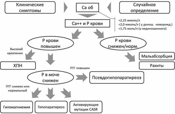 Низкий уровень кальция в сочетании с высоким уровнем фосфора является диагностическим критерием гипопаратиреоза. В зависимости от уровня ПТГ можно отличить псевдогипопаратиреоз от других форм гипопаратиреоза (высокий уровень ПТГ характерен для псевдогипопаратиреоза). Низкий уровень кальция на фоне низкого уровня фосфора свидетельствует о патологии почек, такое сочетание не характерно для гипопаратиреоза любой этиологии (см. рисунок).