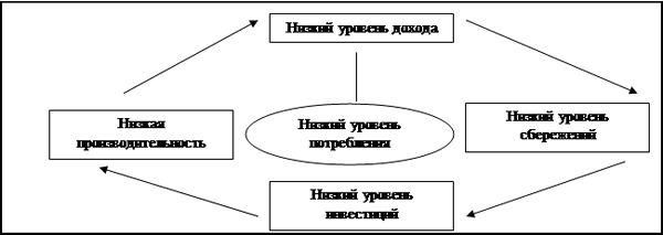 Это понятие характеризует положение беднейших развивающихся стран, экономика которых производит только необходимые средства существования и не поддается преобразованию. Если стране удастся вырваться из «порочного круга», то возникает противоположный процесс, который представляет собой «добродетельный круг». По мере накопления капитала, роста объема производства, начинают расти и доходы, часть которых может быть израсходована на накопление и инвестиции. [7,с.283]