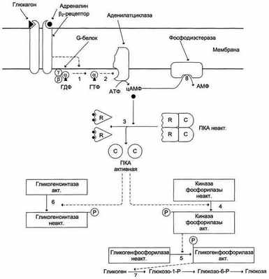1 - глюкагон и адреналин взаимодействуют со специфическими мембранными рецепторами. Комплекс гормон-рецептор влияет на конформацию G-белка, вызывая диссоциацию его на протомеры и замену в α-субъединице ГДФ на ГТФ; 2 - α-субъединица, связанная с ГТФ, активирует аденилатциклазу, катализирующую синтез цАМФ из АТФ; 3 - в присутствии цАМФ протеинкиназа А (цАМФ-зависимая) обратимо диссоциирует, освобождая обладающие каталитической активностью субъединицы С; 4 - протеинкиназа А фосфорилирует и активирует киназу фосфорилазы; 5 - киназа фосфорилазы фосфорилирует гликогенфосфорилазу, переводя её в активную форму; 6-протеинкиназа А фосфорилирует также гликогенсинтазу, переводя её в неактивное состояние; 7 - в результате ингибирования гликогенсинтазы и активации гликогенфосфорилазы гликоген включается в процесс распада; 8 - фосфодиэсте-раза катализирует распад цАМФ и тем самым прерывает действие гормонального сигнала. Комплекс ос-субъединица-ГТФ затем распадается, α-, β- и γ-субъединицы G-белка реассоциируются.