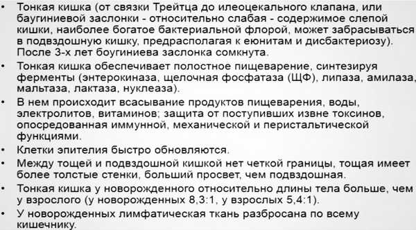 У новорожденного отмечается относительно большая длина тонкой кишки: на 1 кг массы тела приходится 1 м, а у взрослых — 10 см. В связи с относительно большими размерами печени и недоразвитием малого таза кишечные петли лежат более компактно, чем у взрослых. В тонкой кишке происходит основное переваривание и всасывание пищи.