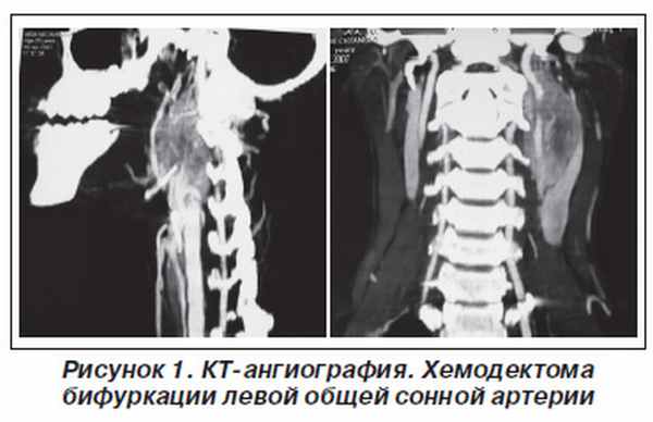 Для подтверждения диагноза ХД используют ультразвуковое дуплексное и триплексное сканирование сонных артерий и методы нейровизуализации: сцинтиграфия, КТ, МРТ в ангиографическом режиме, ангиография. Выбор методики зависит от предполагаемой локализации опухоли, ее размеров. Ультразвуковую допплерографию применяют на первых этапах диагностики ХД. При малых размерах опухоли (до 1 см в диаметре) наиболее информативной ряд авторов считают КТангиографию (ХД выглядит как гиперваскулярное образование в области бифуркации ОСА), которая позволяет точно определять размеры и границы опухоли, ее отношение к органам и тканям. Ряд авторов в ранней диагностике отдают предпочтение сцинтиграфии, при которой накопление радиоактивного изотопа позволяет выявлять ХД минимальных размеров (менее 1 см в диаметре), расположение прилегающих к ним сосудов. Сцинтиграфия, по мнению некоторых авторов, позволяет диагностировать ХД в 75 % случаев. МРТ с контрастированием дает возможность выявлять гиперваскулярный характер опухоли, состояние прилегающих к ней сосудов и благодаря этому отдифференцировать ХД от других опухолей. С целью определения тактики лечения и решения вопроса об операбельности прибегают к ангиографии и рентгенологическому исследованию основания черепа, преимущественно методом компьютерной томографии, результаты которых и являются золотым стандартом. Эти методы дают возможность судить о степени стенозирования сосудов, состояния коллатералей и определить показания к реконструкции сосудов. Характерные ангиографические находки: локализация опухоли над развилкой ОСА, патологическая гиперваскуляризация, интенсивное накопление контрастного вещества [2–4, 6].