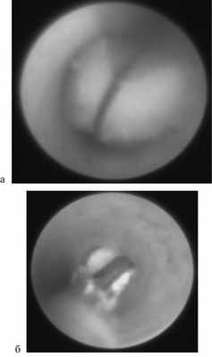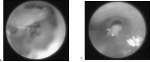 Рис. 2. Лазерная литотрипсия. а — момент процедуры эндоскопического дробления конкремента; б — этап последующего удаления фрагментов разрушенного конкремента протоковыми щипцами.
