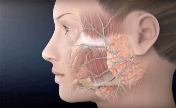 Рак больших слюнных желез на начальных стадиях характеризуется появлением безболезненной округлой плотной опухоли кпереди от ушной раковины или в подчелюстной области. В достаточно короткий временной промежуток она увеличивается в размерах, изъязвляет кожу лица, поражает лицевой нерв. Улыбка человека, при этом становится перекошенной, носогубная складка - сглаженной, а нижнее веко опущено. Отмечается слезотечение. Метастазы в шейные лимфатические узлы проявляются опухолевидными образованиями на боковой поверхности шеи. Признаки отдаленных метастазов обусловлены их местоположением, чаще всего нарушением функции, болью.