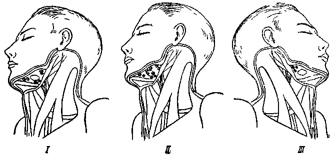 Рис. 76. Три варианта положения лимфатических узлов подчелюстных треугольников по отношению к слюнной подчелюстной железе.