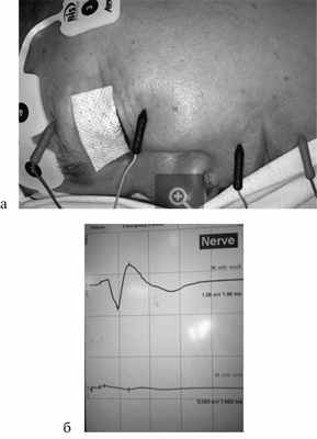Рис. 5. Интраоперационное нейромониторирование. а — вид пациента с установленными электродами; б — аппаратная регистрация проведения нервного импульса по участку лицевого нерва, располагающегося в зоне операционной раны.
