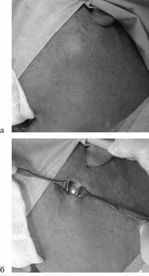 Рис. 4. Диафаноскопия ОСЖ с использованием сиалоэндоскопа диаметром 1,6 мм. а — определение свечения сиалоскопа через кожный покров; б — вид хирургического доступа к выводному протоку околоушной слюнной железы над конкрементом.
