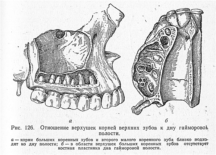 Корни малых и больших верхних коренных зубов могут иметь тесные топографоанатомические соотношения с верхнечелюстной пазухой. Первый премоляр только при сильном развитии пазухи может очень близко подходить к ее нижней стенке. Второй премоляр при значительном развитии альвеолярной бухты верхнечелюстной пазухи нередко отделяется от полости пазухи тонким слоем кости. Редко при большой пазухе с ее небной бухтой дно альвеолы 2 премоляра может находиться в полости бухты, причем верхушка корня отделена от полости только слизистой оболочкой.