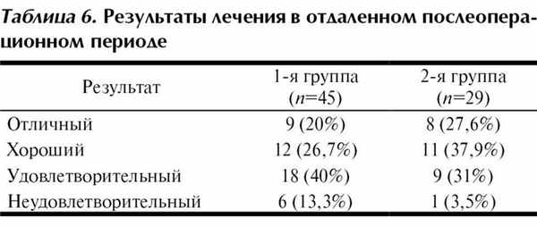 Количество больных с отличными результатами лечения в основной группе увеличилось на 7,6%, с хорошими - на 11,2%, с удовлетворительными результатами снизилось на 9% (табл. 6).