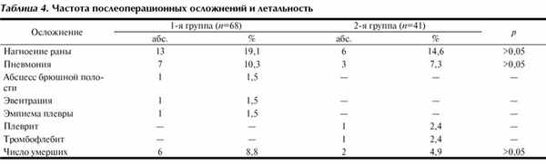 Частота послеоперационных осложнений и летальность при распространенном гнойном перитоните представлены в табл. 4.
