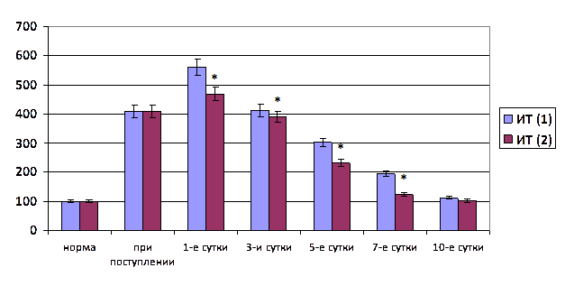 Рис. 1. Динамика индекса токсичности плазмы крови (ИТ) при остром тазовом перитоните на фоне хирургического лечения при лапаротомном (1) и лапароскопическом (2) оперативном доступе (* – достоверность отличия показателя первой и второй групп при р<0,05)