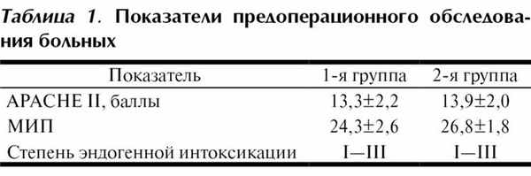 До операции в обеих группах определяли тяжесть состояния больных по шкале APACHE II, степень эндогенной интоксикации и рассчитывали Мангеймский индекс перитонита (МИП).