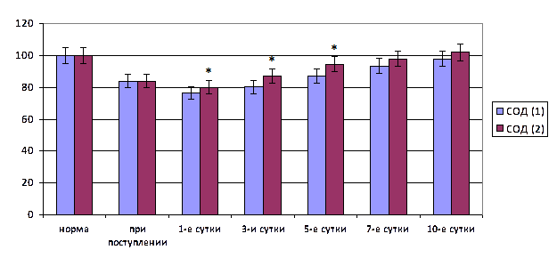 Рис. 3. Динамика активности супероксиддисмутазы в плазме крови при остром тазовом перитоните на фоне хирургического лечения при лапаротомном (1) и лапароскопическом (2) оперативном доступах (* – достоверность отличия показателя первой и второй групп при р<0,05)