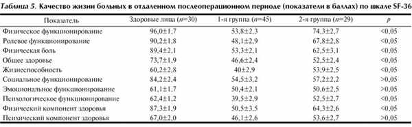 При изучении результатов лечения больных в отдаленном послеоперационном периоде отмечается снижение показателей как физического, так и психического компонентов здоровья по сравнению с общей популяцией (табл. 5). При сравнении исследуемых групп установлено, что интегральный показатель физического компонента здоровья у пациентов основной группы в 1,3 раза (р<0,05), а психический компонент здоровья в 1,16 раза выше (р>0,05), чем в контрольной группе.