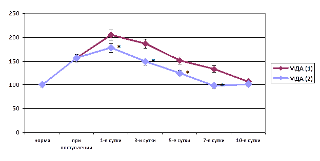 Рис. 2. Динамика малонового диальдегида крови при остром тазовом перитоните на фоне хирургического лечения при лапаротомном (1) и лапароскопическом (2) оперативном доступе (* – достоверность отличия показателя первой и второй групп при р<0,05)
