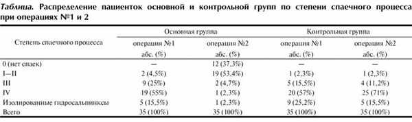 Во 2-й (контрольной) группе при первой операции IV степень спаечного процесса диагностирована у 20 (57%) пациенток; II—III степень — у 5 (15,5%) женщин; I—II степень спаечного процесса отмечена в одном (2,3%) случае; у 9 (25,2%) больных — изолированные гидросальпинксы.