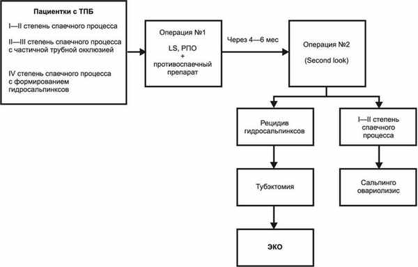 На основании проведенных исследований нами разработан алгоритм лечения пациенток с трубно-перитонеальным бесплодием (рис. 7). Рисунок 7. Алгоритм лечения пациенток с ТПБ с использованием противоспаечных препаратов. LS — лапароскопия; РПО — реконструктивно-пластическая операция; ЭКО — экстракорпоральное оплодотворение.