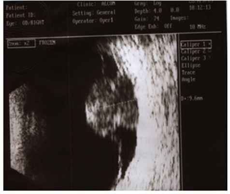 2. Ультразвуковое исследование – ведущий метод диагностики опухолей глаза. Методика проведения контактная и безболезненная. Сканирование позволяет «увидеть» опухоль при непрозрачных средах глаза, установить ее размеры.