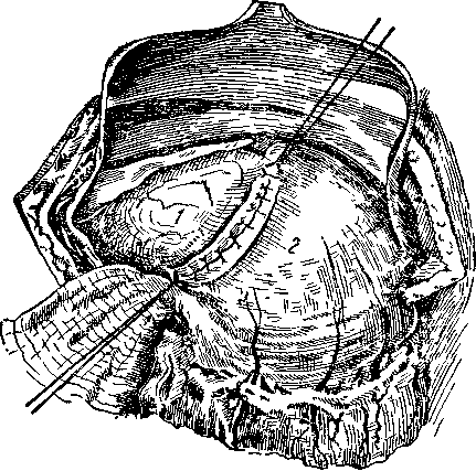 По углам раны накладывают 2—3 шва с таким расчетом, чтобы в ране свободно помещалось дно желчного пузыря, после чего узловатыми шелковыми швами подшивают его со всех сторон к париетальной брюшине. По мере подшивания желчного пузыря к брюшине извлекаются отгораживающие тампоны.