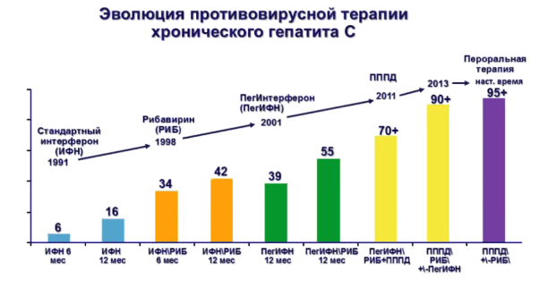 С появлением рибавирина и пегилированных интерферонов, эффективность лечения составила 55% — 60%. Следующим этапом стало появление тройной терапии, включающей два противовирусных препарата в комбинации с интерфероном. Эффективность возросла еще больше и составила около 70-75%.