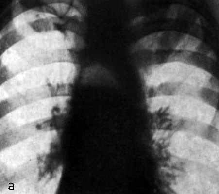 Хронический медиастинит часто является результатом туберкулезной инфекции (бронхаденит), грибковых поражений, перенесенного острого гнойного медиастинита. Клинические проявления обусловлены развивающимся фиброзом клетчатки средостения и прогрессирующим сдавленном верхней полой вены, пищевода, легочных вен. Больные жалуются на боль, повышение температуры, одышку при физической нагрузке, изменение голоса (сдавленно возвратных нервов). Клинические проявления соответствуют степени расширения средостения при рентгенологическом исследовании грудной клетки.
