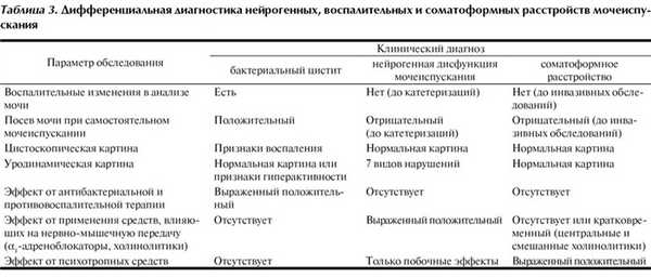 Параклинические методы диагностики ННМ и ПНМ. Использование параклинических методов позволяет установить наличие и локализацию поражения нервной системы (магнитно-резонансная томография головного и/или спинного мозга), связь между появлением «урологических» симптомов и поражением нервной системы (соматосенсорные вызванные потенциалы), исключить органическое поражение мочевых путей (УЗИ), а также диагностировать органный невроз (табл. 3) [20—22].