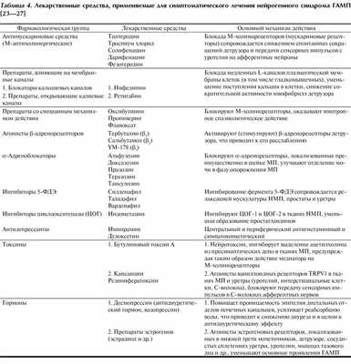 Фармакотерапия и фармакологический анализ. Определив форму нарушения мочеиспускания и установив связь с заболеванием нервной системы, т.е. установив диагноз «нейрогенный мочевой пузырь» (N31.0 по МКБ-10) или «соматоформная дисфункция вегетативной нервной системы» (F45.3 по МКБ-10), клиницист назначает специфическое лечение. В практике нейроуролога используются лекарственные средства, влияющие преимущественно на холинергические, адренергические и значительно реже на другие нейромедиаторные системы (табл. 4). Оказывая выраженный терапевтический эффект у пациентов с ННМ, эти средства не влияют на динамику ПНМ. В частности, при назначении антихолинергических средств пациентам с учащенным мочеиспусканием тревожного происхождения не только не наблюдается эффект уменьшения частоты дневных позывов на мочеиспускания, но к нему присоединяется затрудненное мочеиспускание. По нашему мнению, подобные побочные эффекты можно использовать для дифференциальной диагностики ПНМ и ННМ.