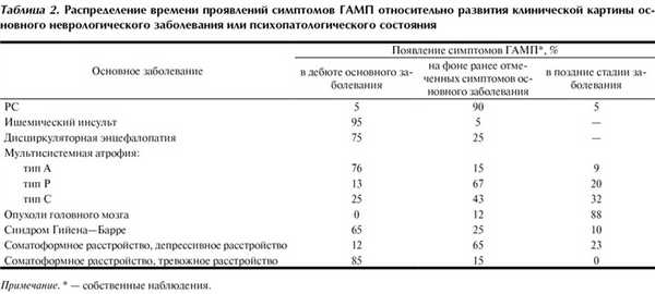 Время появления ННМ и ПНМ. Нейрогенные расстройства мочеиспускания могут быть первыми проявлениями заболевания (дисциркуляторная энцефалопатия) или присоединяться на поздних стадиях болезни (болезнь Паркинсона, болезнь Альцгеймера). В некоторых случаях СНМП развиваются в первые сутки заболевания и постепенно регрессируют (ишемический инсульт, синдром Гийена—Барре), в других — указывают на обострение основного заболевания (РС ремиттирующего течения) (табл. 2) [19]. Прогноз дальнейшего развития дисфункций МП, как правило, зависит от течения основного неврологического заболевания и в большинстве случаев остается неблагоприятным. Исключением можно считать постинсультные нарушения мочеиспускания (при возобновлении нормального его ритма в течение восстановительного периода), что обусловлено функциональной реорганизацией центров мочеиспускания и синдром Гийена—Барре (при успешной ремиелинизации периферических нервных волокон). Нарастание симптоматики дисфункций МП возможно даже при уменьшении неврологического дефицита на фоне лечения основного заболевания (например, неполная ремиссия РС).