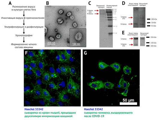 В ходе электрофореза SDS-PAGE и вестерн-блоттинга (ВБ) концентратов вакцин перед инактивацией и после хроматографии, окрашенных сыворотками реконвалесцентов после COVID-19 (рис. 1 C и D), были выявлены два основных белка в концентратах: N и S, которые должны содержаться и в препарате вириона. С помощью окрашивания сывороткой анти-S-белка (рис. 1E) были обнаружены две формы S-белка в вирусных препаратах до и после инактивации: S1 и полноразмерный S-белок. Это свидетельствует о том, что в вакцинном препарате присутствует антиген-мишень для индукции синтеза НАт.