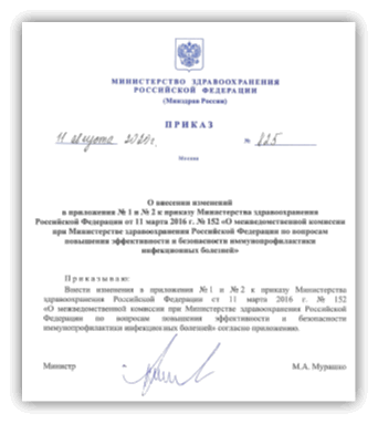 В 2016 г. при Министерстве здравоохранения Российской Федерации была сформирована межведомственная комиссия по вопросам повышения эффективности и безопасности иммунопрофилактики инфекционных болезней Приказом Министерства здравоохранения РФ от 11 марта 2016 г. №152 «О межведомственной комиссии при Министерстве здравоохранения РФ по вопросам повышения эффективности и безопасности иммунопрофилактики инфекционных болезней».