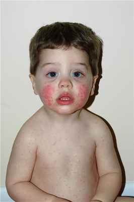 Как только эти симптомы начинают ослабевать, на лице появляется характерная красная сыпь. Красные пятна на щеках ребенка похожи на следы от пощечин. Затем сыпь распространяется на грудь, живот, спину, руки и ноги, но не на ладони и подошвы. Обычно она не вызывает зуда.