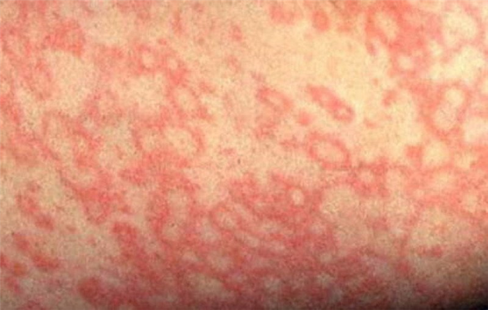 Сначала сыпь проявляется в виде пятен, которые начинают исчезать от центра и начинают походить на своеобразные кружева.