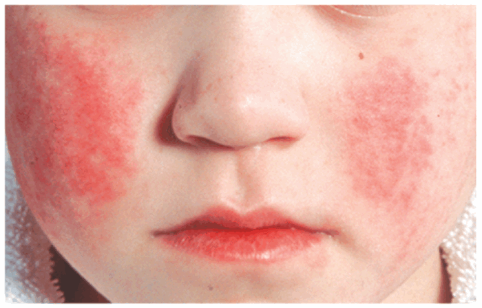 Типичная сыпь на лице обычно появляется не в самом начале болезни, а спустя несколько дней, и, как правило, сразу на обеих щеках.